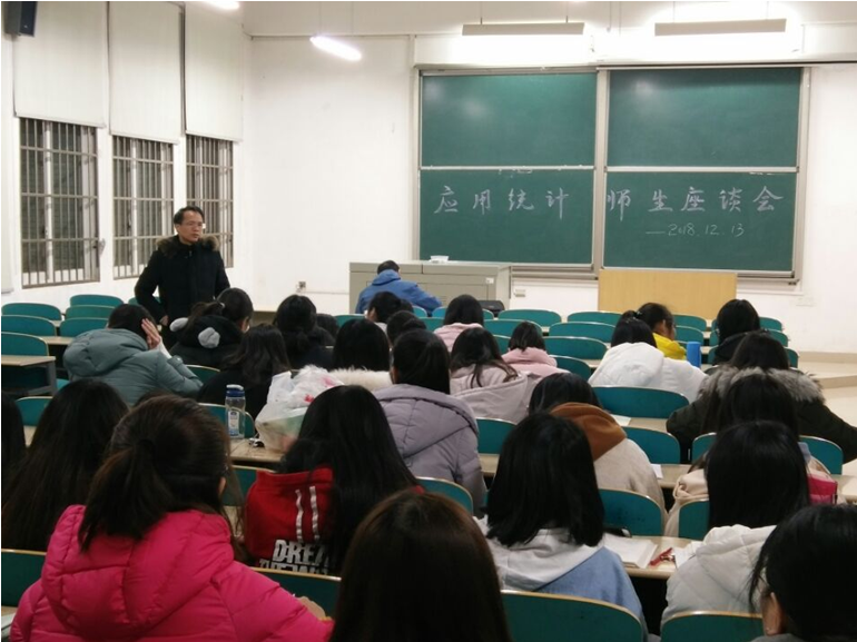 2018年12月13日晚上7:30-9:00,在云塘校区理科楼A102教室,统计系主任朱恩文、副主任陈志高和方亮等部分老师和应用统计专业大二、大三和大四的学生代表进行了一次师生座谈会。