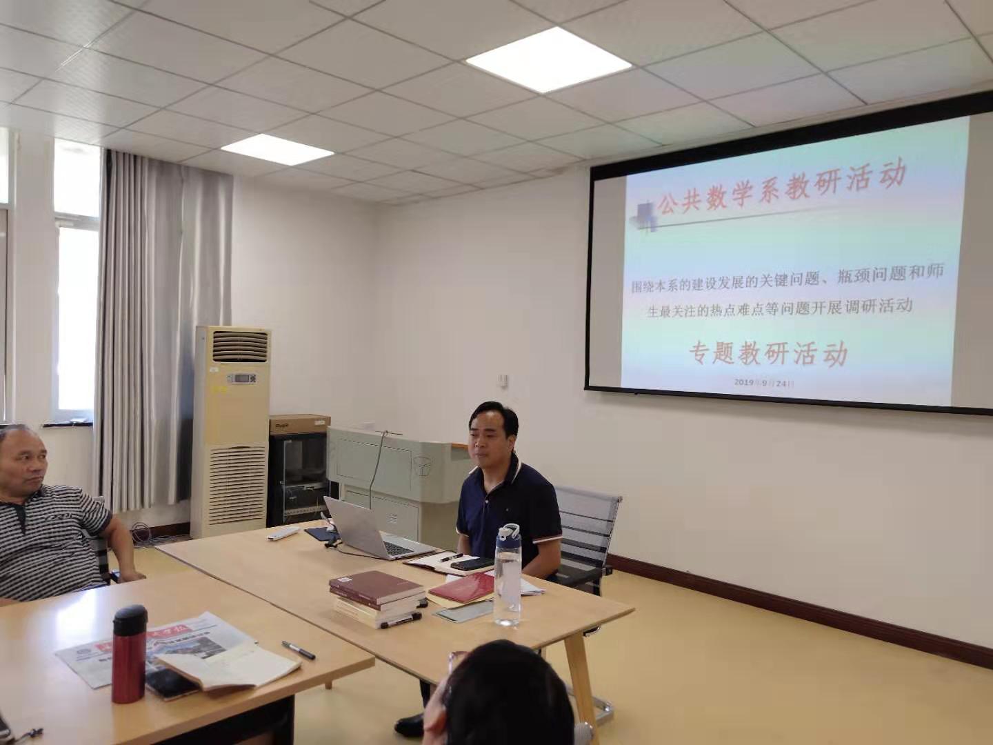 黄院长首先指出,本次调研活动是学院开展“主题教育”活动的一个重要部分,调研的目的是为了收集公共数学系在发展与建设当中遇到的问题,以便学院能及时发现问题,及时解决问题。
