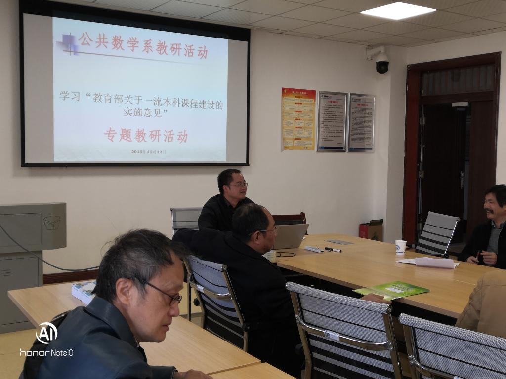 11月19日下午,公共数学系在理科楼A-311举行了学习《教育部关于一流本科课程建设实施意见》的专题教研活动,会议由公共数学系主任谭艳祥主持,数统学院院长黄创霞参加了教研活动。