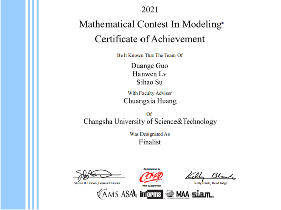 近日,2021年美国大学生数学建模竞赛结果正式公布。伟德共获得特等奖提名奖(Finalist)1项和二等奖(Honorable Mention)6项的好成绩。数学与统计学院黄创霞教授指导的郭端格、吕翰文、苏思浩3名同学组成的代表队获得此次竞赛的特等奖提名奖, 实现了学校在此项比赛上的突破。