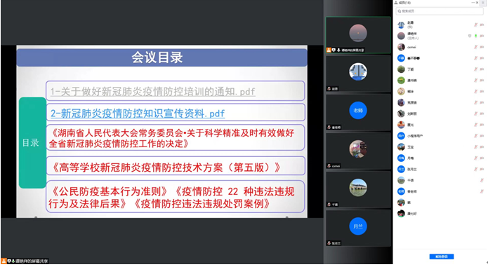 会上,公数系教师通过线上方式集体学习了《湖南省人民代表大会常务委员会关于科学精准及时有效做好全省新冠肺炎疫情防控工作的决定》、《高等学校新冠肺炎疫情防控技术方案(第五版)》、《公民防疫基本行为准则》、《疫情防控 22 种违法违规行为及法律后果》等资料的重点内容。