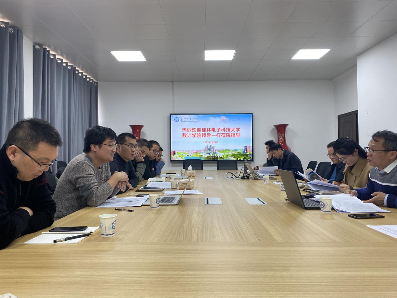 鉴于我院近几年在专业建设、人才培养、课程建设、公共数学教学、学科竞赛等方面取得显著成效, 2023年2月24日上午,桂林电子科技大学数计学院副院长吴孙勇带领考察组赴我院交流调研。为进一步完善两院人才培养方案、公共数学改革,提升教学管理水平,我院党委书记邓崛峰、党委副书记郑忠辉、副院长仝青山、副院长李姣率领系(部)负责人与以吴孙勇副院长为首的代表团于伟德betvlctor1946源于英国理科楼A-410召开交流调研会议。