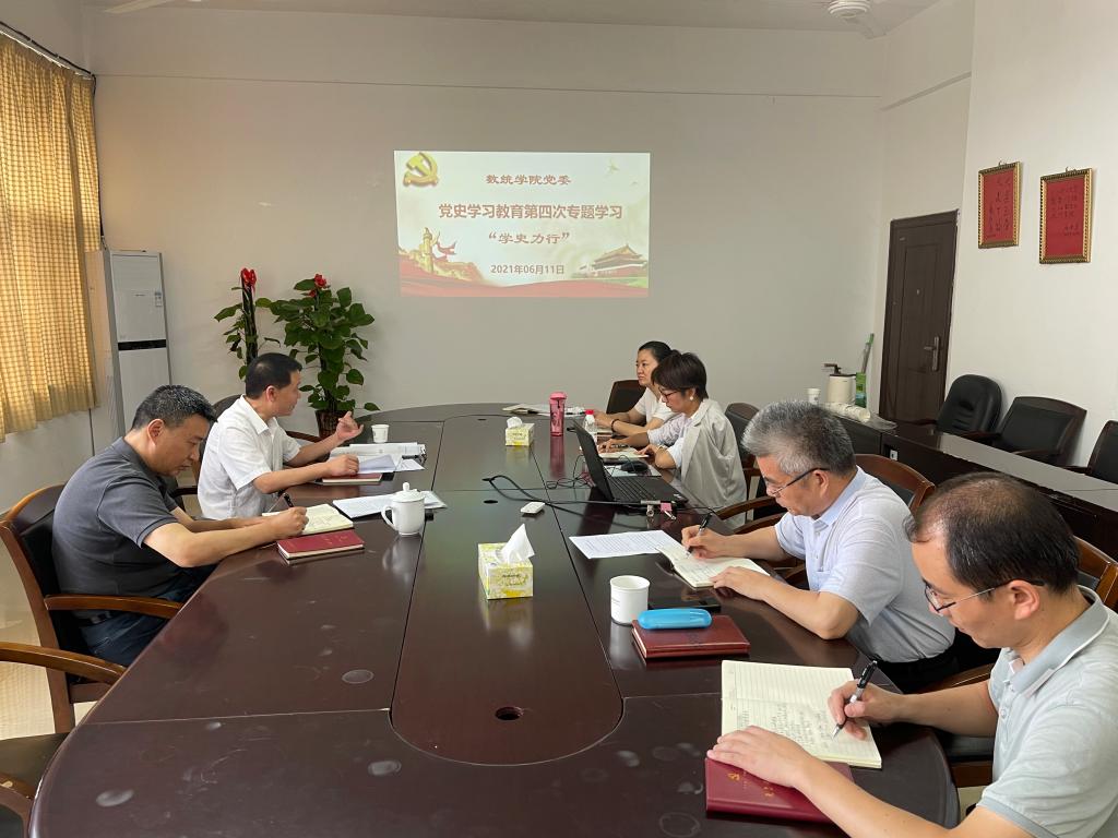 6月11日上午,学院党委理论学习中心组在理科楼A410开展党史学习教育第四专题学习。党委书记邓崛峰带领大家学习了学校党史学习教育领导小组办公室关于开展第四次专题学习有关要求的通知精神,并结合《求是》2021年第11期《从党的光辉历史中汲取砥砺奋进的精神力量》一文,重点学习了湖南省委书记许达哲同志在省委党史学习教育领导小组会议上的讲话精神。学院党委理论学习中心组成员参加学习。