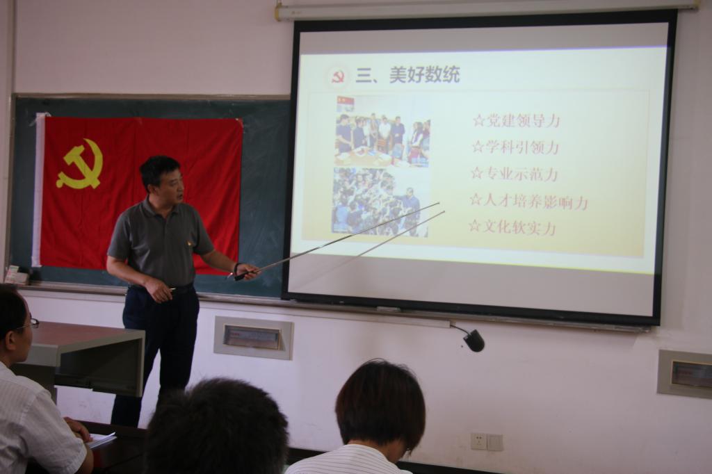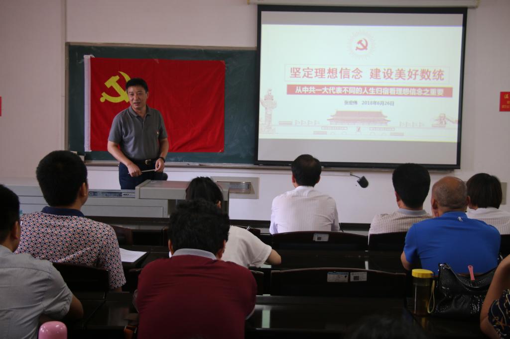 议程第二项邀请被推荐为年度优秀党支部书记、优秀党员的罗煦琼老师、谭艳祥老师发言。两位老师分别从支部工作和作为一名年轻教师在工作中取得的成绩和经验向大家做汇报发言,两位老师的发言获得了全场老师的掌声。活动最后一项由张宏伟书记主讲党课:“坚定理想信念、建设美好数统”,50分钟的党课,张书记分三大部分(中共一大的概况、13位代表不同的人生轨迹和结局、不同人生结局给我们的启示与美好数统)为大家讲述,从历史到目前学院的现状与发展,不时发出掌声和笑声,大家都听得很投入。这次党课,让所有党员更清晰的了解‘不忘初心、牢记使命’的意义。通过开展主题党日活动,进一步增强了党员干部的党性信念和爱党信党护党决心,激发了党员干部想事、谋事、干事的热情,大家纷纷表示,在今后的工作生活中要更加严格要求自己,坚定理想信念,履行党员教师职责,为建设美好数统而努力。