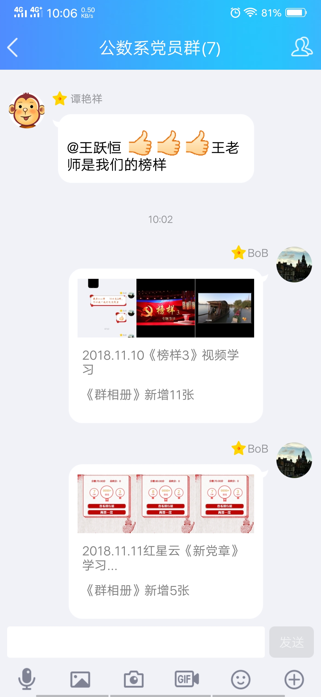 2018年11月10日,公共数学系党支部在支部书记吴烨的组织下,全体7名正式党员,通过公共数学系党员Q群,集体观看了《榜样3》视频,并写下了各自的《观后感》。我们的时代是先进典型辈出的时代,崇高事业的赓继传承伴随着中国共产党员的前赴后继,我们是普通的共产党员,但是我们有榜样的力量激励,我们会时刻向先进典型学习,在一点一滴中完善自己,从小事小节上修炼自己,以自己的实际行动学习先进、保持先进、赶超先进。