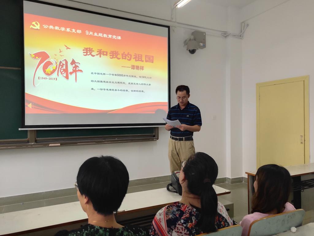 9月27日下午,学院公数系党支部开展了一堂主题为“我和我的祖国”的音乐微党课,旨在深入开展“不忘初心、牢记使命”主题教育。此次主题党课在庄严的国歌合唱声中开启,紧紧围绕主题“守初心、担使命、敬业爱岗抓落实”展开;在《我和我的祖国》合唱声中体现了全体党员的爱国情怀和对祖国70华诞的深情祝福。