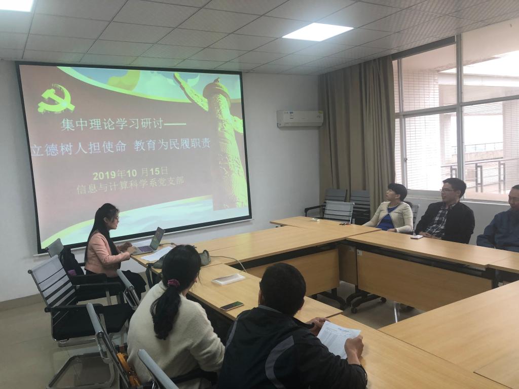 在“立德树人担使命,教育为民履职责”主题教育背景下,10月15日下午,信息与计算科学系党支部组织全系老师在教研室理科楼A502集中学习了《教育部关于深化本科教育教学改革全面提高人才培养质量的意见》以及《伟德betvlctor1946源于英国2019年度本科教育与人才培养工作考核指标体系》。会议由支部书记李姣主持。
