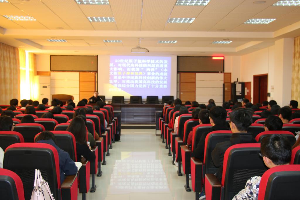 学校常务副校长洪源渤教授首先对郭柏灵院士的此次到来表示感谢。报告会上,郭柏灵院士回顾了我国“两弹一星”事业的发展史,介绍了中国核武器的研制背景、发展历程及“两弹一星”事业取得重大突破的成功经验。他结合自身参与“两弹”研究的经历,用大量感人的事例和图片资料,向大家讲述“两弹一星”功勋奖章获得者钱三强、彭桓武、邓稼先、郭永怀、朱光亚、周光召等老一辈科学家在艰苦的条件下无私奉献,克服种种困难,为“两弹一星”的研制成功做出突出贡献的感人事迹。