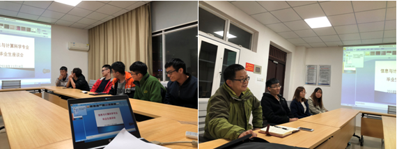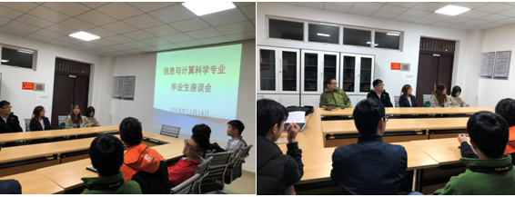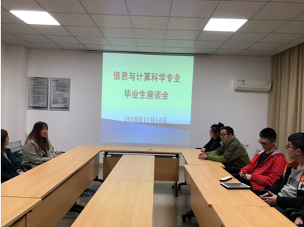 11月14日晚7点,信息与计算科学系组织信计专业的部分毕业生在理科楼A502召开了座谈会,分管本科生教学工作的龚红仿副院长和信计系副主任李姣出席了此次座谈会。