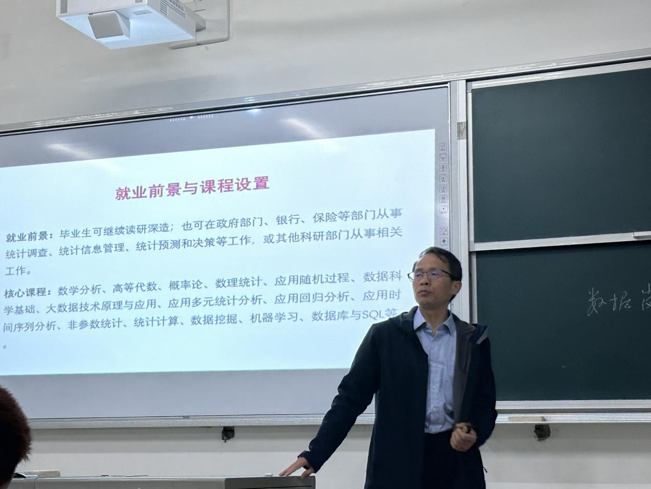 11月21日晚,统计学系朱恩文教授在综合教学楼B-108给应用统计学2023级新生开展了一次专业教育讲座。朱恩文教授的讲座从专业历史与发展、就业前景与课程设置、统计相关名人和优秀校友介绍等方面展开,使同学们对自己选择的专业有了更深入的了解。