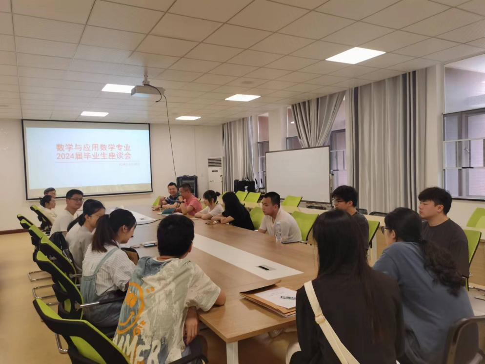 6月18日,数学与应用数学系在理科楼A212召开本专业2024届本科毕业生座谈会,数学与应用数学系主任胡海军老师,党支部书记郎广名老师,副系主任赵康老师,以及数学与应用数学专业2024届毕业生代表参加座谈议。会议由系主任胡海军老师主持。