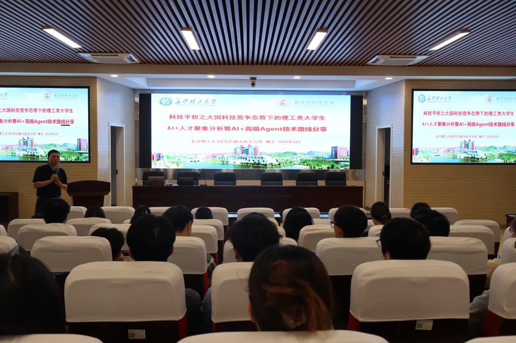 6月26日,湖南节点新火信息安全有限公司总裁梅宇先生应信息与计算科学系邀请,在理科楼A200做了题为“AI+人才聚集分析暨AI+Agent技术路线分享”的通识教育讲座,讲座由信计系姜英军教授主持,信息与计算科学专业学生参加了讲座。