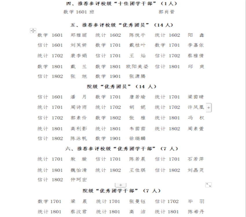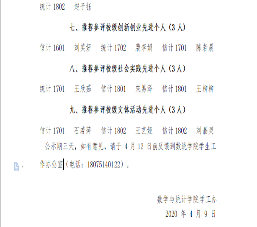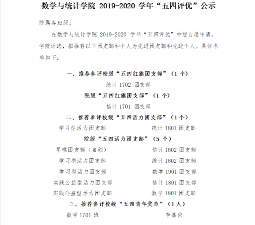 数统学院2019-2020“五四评优”名单公示