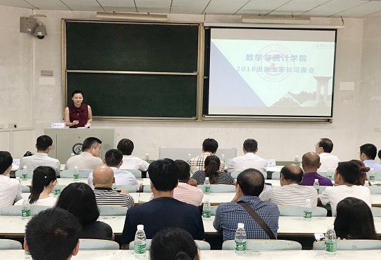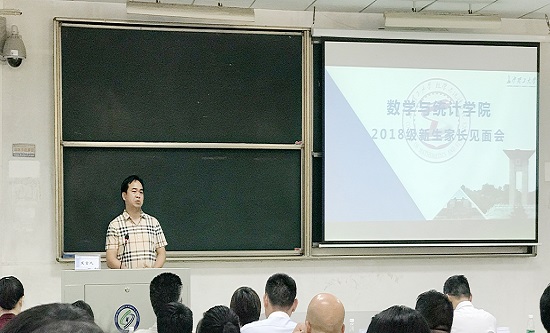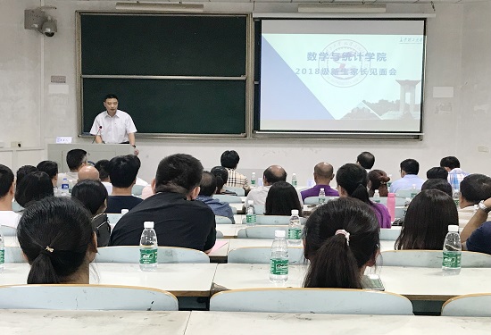9月9日下午,数学与统计学院在金盆岭校区6教学楼108室召开了2018级新生家长见面会。院党委书记张宏伟,院长黄创霞,院党委副书记马丽,副院长仝青山、王佳伏、李景、龚红仿,学工办主任肖凤,2018级辅导员柳映堂,以及新生班主任参加了本次会议。会议由院党委副书记马丽主持。