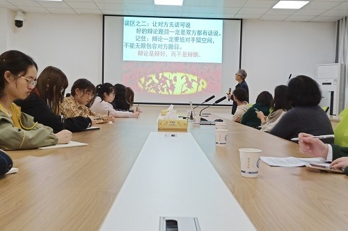 培训伊始,成松柳教授就其丰富的辩论履历及独到的见解,向同学们介绍辩论赛中常见的几大误区及辩手间应如何分工协作,无论是最基础的破题、立论,还是进阶型的攻辩、陈词,成松柳教授均结合事例,耐心地向同学们一一讲解。