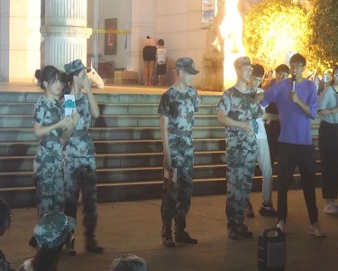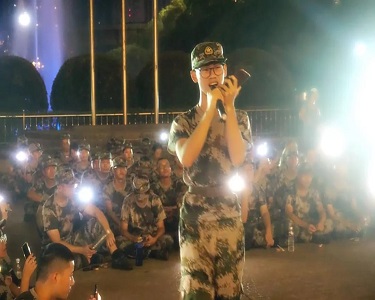 最后,由19级辅导员崔培东主持进行各排之间拉歌比赛。各排不甘示弱,现场氛围活跃,同学们气宇轩昂,似乎忘记了军训带来的疲惫感,沉浸在欢歌笑语中。