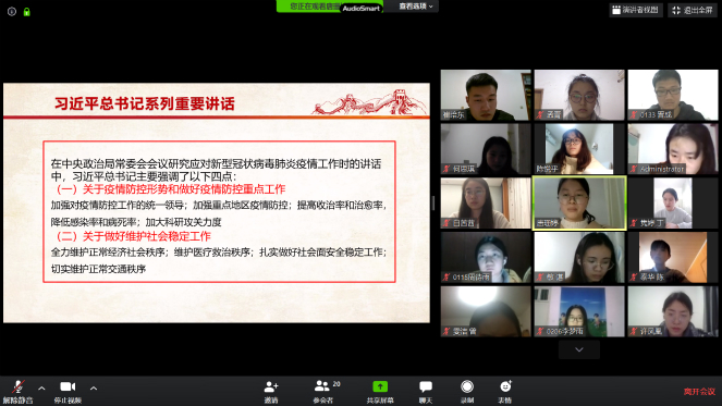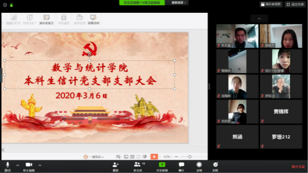 3月1日至3月11日,数学与统计学院本科生数学、信计、统计党支部和研究生党支部分别于线上召开“齐心战‘疫’,党旗飘扬”专题组织生活会,党支部书记和全体学生党员参会。