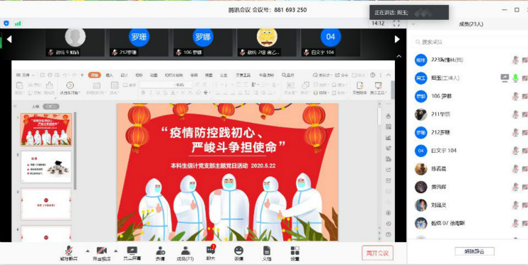 研究生党支部举行了此次活动,活动中,杨爽老师为全体研究生党员进行了心理防疫知识团体辅导,围绕“基本防疫知识”“读懂情绪”“认识身心系统”“我们可以做什么”四个方面展开。首先,杨爽老师介绍了卫生防疫知识和心里防疫知识,并告诉研究生党员们,坚持“戴口罩”“少聚集”等行动就是在为疫情做出贡献。接着杨爽老师分别介绍了疫情期间常见的情绪——悲伤、恐惧、枯竭、愤怒、绝望无助和内疚等,并分析了这些情绪产生的原因,以及如何应对这些情绪。最后,杨爽老师告诫与会党员,要充实因疫情在家的这段时间,不能荒废度过,同时她还强调,作为一名党员要关爱身边同学,及时发现身边同学的异常,并给予关心关爱。