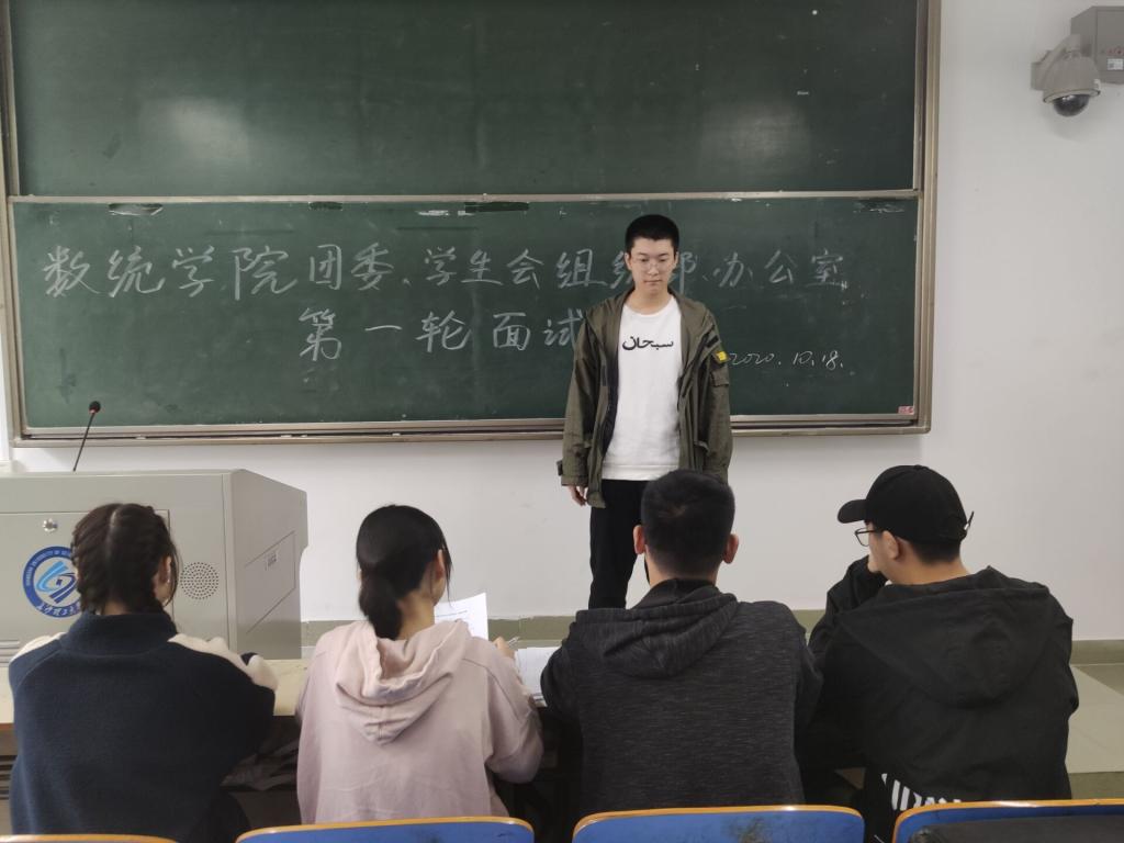 10月17号下午两点,数学与统计学院团委、学生会全体成员在金盆岭校区六教进行了第十二届团委、学生会第一轮招新面试活动。第一轮面试采用各面试者需进行简短的自我介绍,随后各部门负责人针对各面试者的不同情况进行提问的方式进行。