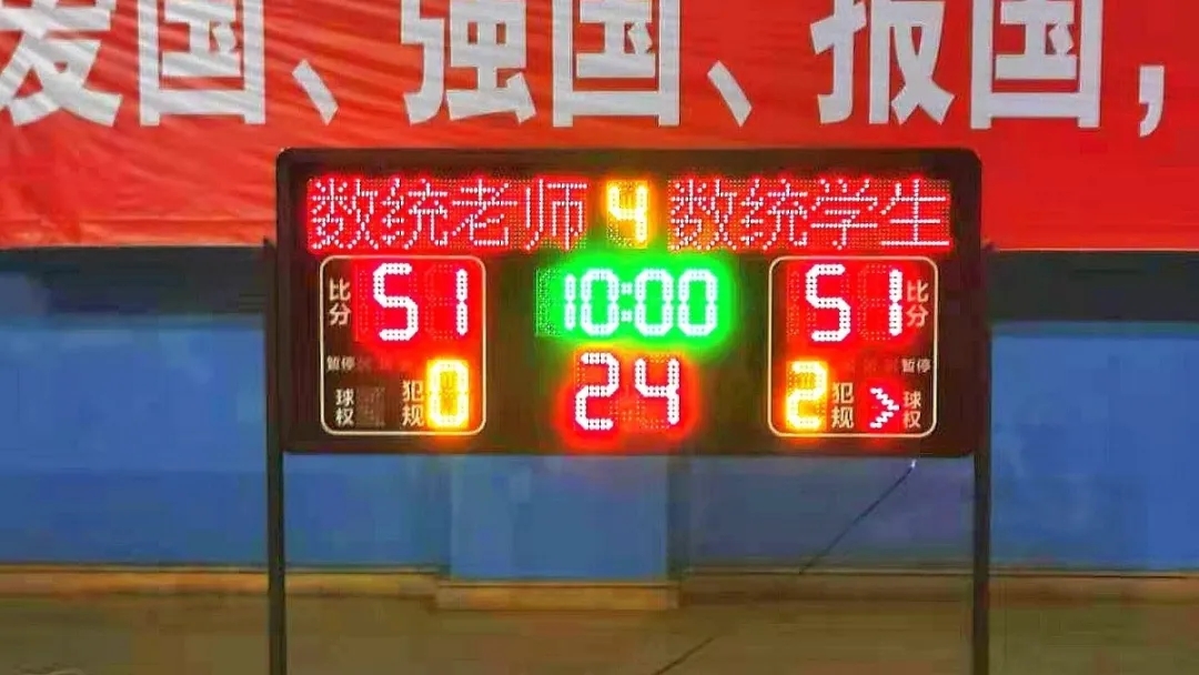 比赛开始前,赛场的周围围满了前来观看的同学们,参加比赛的老师和同学们也热情高涨,跃跃欲试,做好充分的热身运动。紧接着,比赛在响亮的哨音中正式开始,双方选手全神贯注地投入到激烈的“对战”之中,双方你来我往,现场的气氛急剧攀升,比赛的双方很快就进入了角逐的状态。在场的同学们用他们的喊声来表达着自己的激动,为他们加油。比赛的双方也越来越有激情,用各种各样的篮球技巧和精准的投篮为自己的队伍贡献了一分又一分。中场休息时,两队双方根据场上形势及时调整战术,强调攻防,为后半场比赛最好统筹规划。虽然数统老师队比分比较落后,但是他们并没有气馁,而是鼓足干劲,一次又一次的抢夺篮板、投篮。在激烈的比拼对抗中,两队比分差距一点点缩小。最终,以51:51的比分打成了平局。