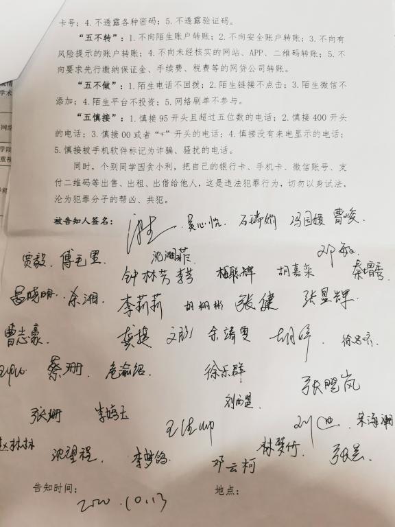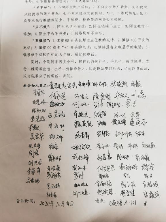 会后,全体研究生分班召开安全教育主题班会,学习并签署了《谨防电信网络诈骗告知书》。