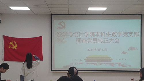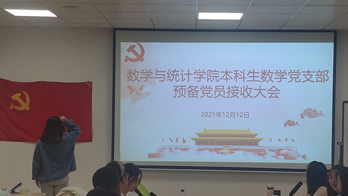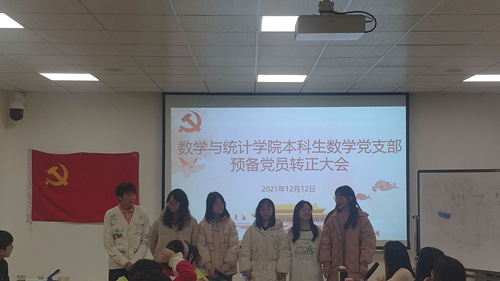 2021年12月12日,数学与统计学院本科生数学党支部在理科楼A212召开党员转正与接收大会,大会分别由张紫嫣和邹慧婷同志主持,党支部全体党员参加。