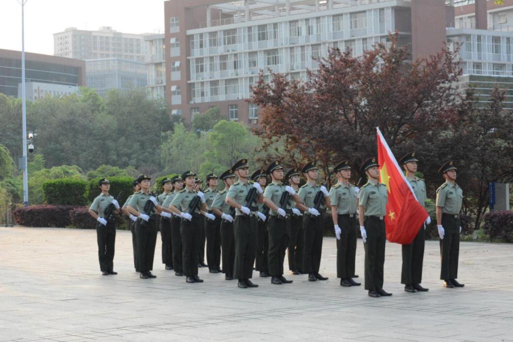 升旗仪式伊始,国旗班成员介绍升旗仪式流程并宣布升旗仪式开始。升旗仪式第一项,迎国旗。随着一声令下,国旗班全体成员迈着整齐划一的步伐,庄严的护送着五星红旗缓缓走向升旗台。升旗仪式第二项,升国旗,奏国歌。英姿飒爽的国旗班成员迈着铿锵的步伐护送着鲜艳的五星红旗来到国旗台前,在初升太阳的映照下,伴随着《中华人民共和国国歌》的响起,五星红旗缓缓升起,迎风飘扬在学校的上空。在场学生不约而同地面向国旗行注目礼,他们坚毅的目光展现了当代青年的勃勃生机。升旗仪式第三项,国旗下宣誓。在国旗班成员的带领下,在场学生面向国旗庄严宣誓。