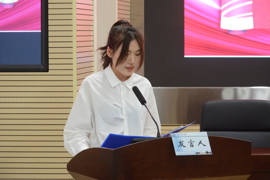 大会第四项,毕业研究生代表吴心怡同学发表毕业感言。吴心怡回首三年研究生求学生涯所看、所学、所为,并寄语全体同学:“轻装策马青云路,人生从此御长风。我们跃入人海,各有风雨灿烂,祝愿各位前途光明、前程似锦。”