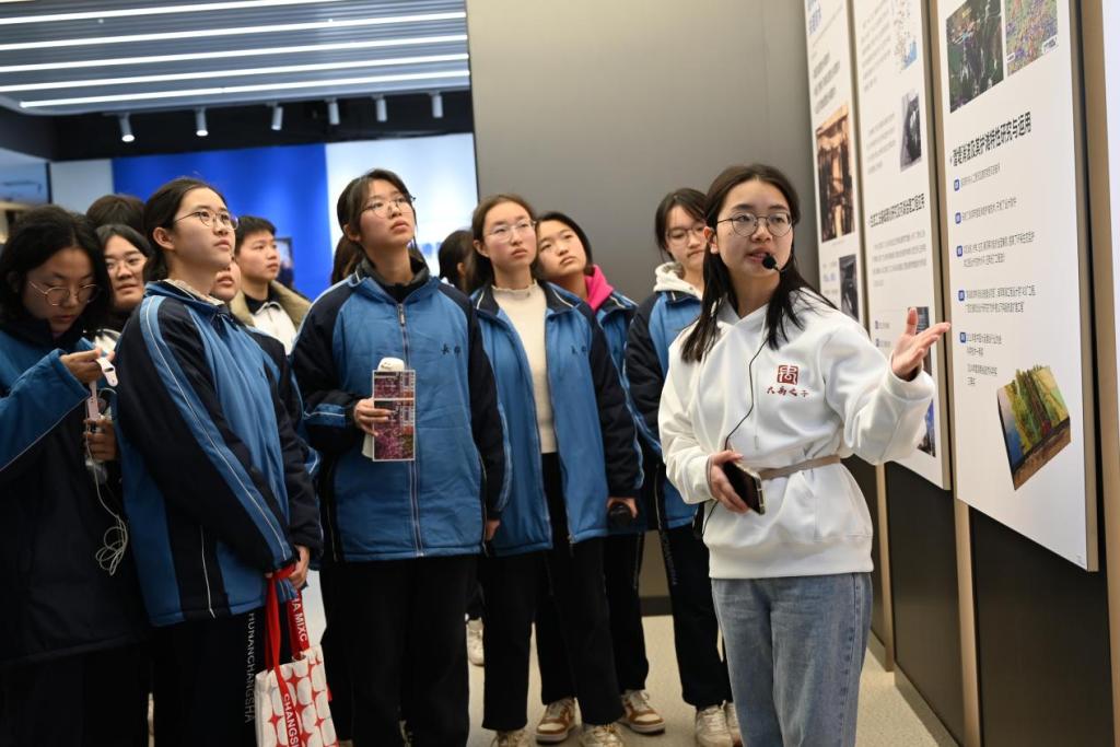 在水利与环境工程学院,长沙市长郡湘府中学高中部师生参观了洞庭湖水环境治理与生态修复湖南省重点实验室。在实验室展厅,志愿者讲解员曹丽娇介绍了该实验室的基本情况及发展历程并介绍高等级航道工程建设关键技术及应用等科研成果。以洞庭高性能流域数字模型、洞庭湖流域水安全要素精准预报技术为切入口,她向师生们展示了智慧水利在抗洪救灾、生态修复上所发挥的重要作用、学院在水利基础设施建设以及破解水利重大难题所作出的贡献。