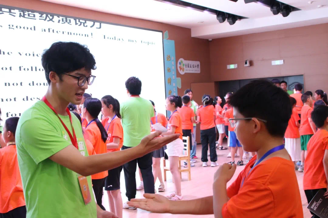 下午,“最强大脑”亚洲记忆女王罗兴钊为学员们带来团队活动:演说力训练。以团队的形式让学员与志愿者们一起合作英语演说,志愿者们一对一教孩子们英语演讲时的手势,帮助他们纠正发音。学员们沉浸在这独具匠心的课堂里,迫不及待的向志愿者们展示刚刚学习的英文演讲,团队活动让他们的心更加紧密的联系在一起。