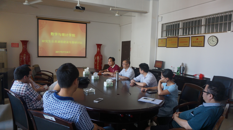 2017年7月4日下午3:00数学与统计学院在云塘校区理科楼A区-410组织召开研究生数学公共课研讨会,会议由院长黄创霞教授主持,相关研究生数学公共课任课老师参加了本次研讨会。