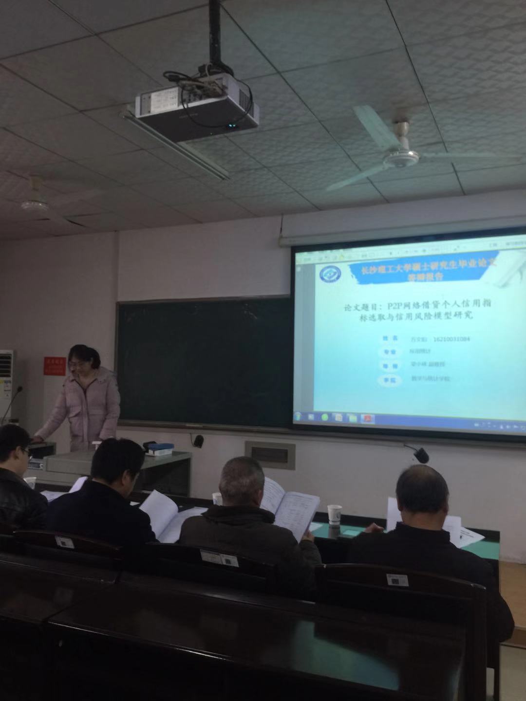 12月20日下午2点,在理科楼A419进行了数学与统计专业2018届下半年专业学位硕士研究生毕业论文答辩会。答辩委员会主席由应用统计专业学科带头人梁小林副教授担任,委员由黄创霞教授、龚红仿副教授、戴志锋副教授,以及湖南大学胡宗义教授组成。8名答辩学生及其它专业部分研究生参加了此次答辩会。会议由梁小林副教授主持。