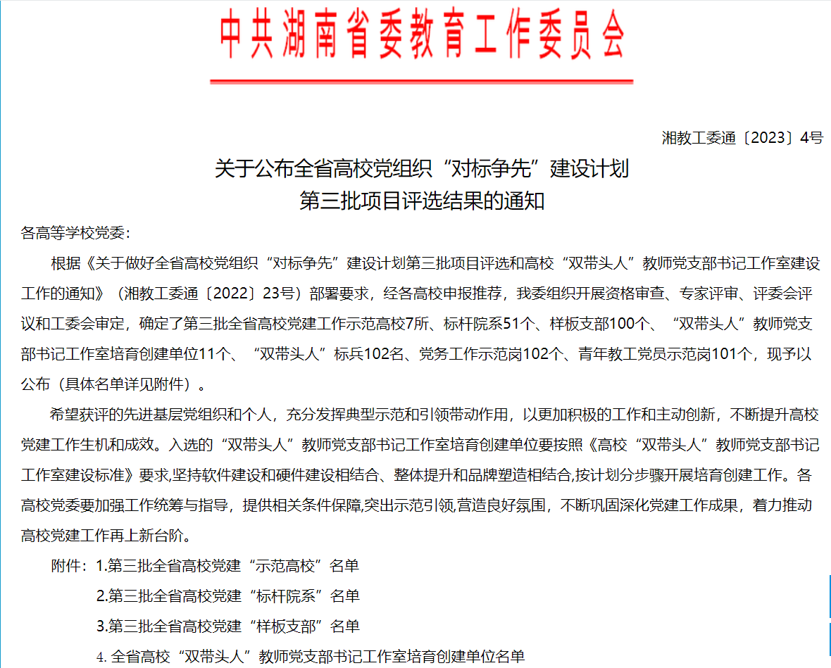 2022年12月,根据湖南省委教育工委发布的《关于做好全省高校党组织“对标争先”建设计划第三批项目评选和高校“双带头人”教师党支部书记工作室建设工作的通知》(湘教工委通〔2022〕23号)部署要求,土木工程学院党委积极申报,经学校评审推荐,中共湖南省委教育工委资格审查、专家评审、评委会评议和工委会审定,确定了第三批全省高校党建工作示范高校7所、标杆院系51个、样板支部100个、“双带头人”教师党支部书记工作室培育创建单位11个、“双带头人”标兵102名、党务工作示范岗102个、青年教工党员示范岗101个。