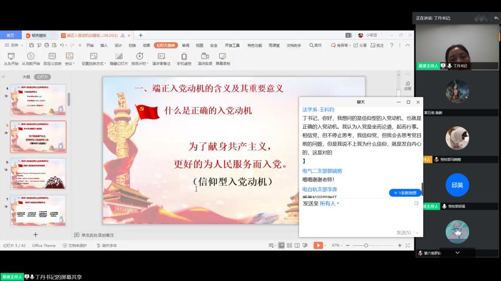 4月28日晚,土木工程学院分党校联合电气学院分党校在腾讯会议平台开展《端正入党动机,加强党性修养》专题党课,土木学院党委副书记(主持工作)丁丹应邀主讲,第11期全体党员发展对象参加学习。