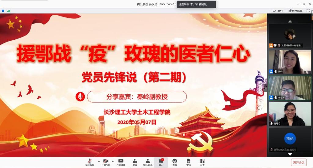 为深入学习领会习近平总书记关于疫情防控工作的重要指示精神,做好2020年春季学生开学准备工作。5月7日晚,土木工程学院特邀“最美逆行者”——中南大学湘雅医院援鄂医疗队副主任医师秦岭做客“党员先锋说”(第二期)活动,以直播的方式,为学院师生党员上了一堂触及灵魂深处的特殊党课。学生党总支副书记李小军主持学习,院党委副书记黄阿明,院团委书记綦丽、学工办叶正芳、董治佑老师和学生党员代表共计300人聆听了这堂特殊的思政大课。