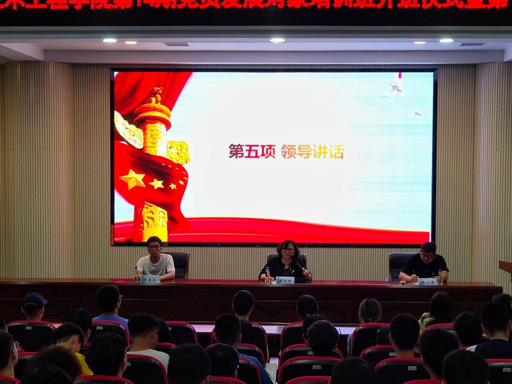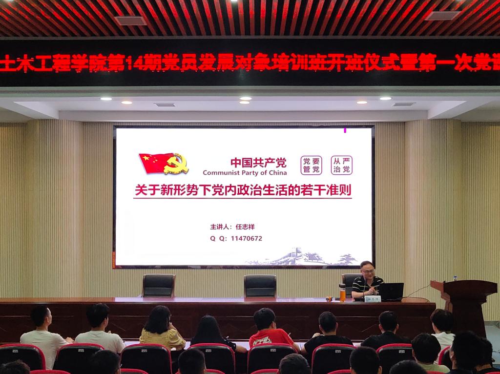 5月10日晚,土木工程学院分党校在工科二号楼B302举行第十四期党员发展对象培训班开班仪式暨第一次专题党课,校党政办公室文秘科科长任志祥老师应邀主讲,院党委副书记黄阿明,培训班负责人候惠文、学习党员与全体发展对象参加。院学生党总支副书记李小军主持开班仪式。