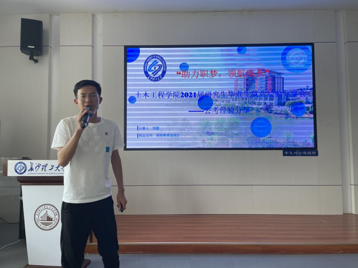 首先,即将入职湖南省交通规划勘察设计院有限公司的李唐,他给同学们详细介绍了房地产与设计院的区别与各自的优劣势,也介绍了在几家公司实习的体验和收获,指出要充分利用好暑假和周末的时间,处理好科研与实习的关系,尽量多实习。他结合自己的经历对求职面试进行细致的讲解,例如如何在面试中展现最优秀的自己等。