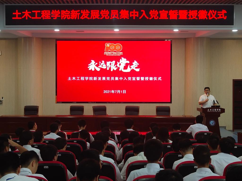在仪式开始前,全体成员集中观看了“庆祝中国共产党成立 100 周年”电视直播。纪念大会结束后,李小军首先宣读《土木工程学院新发展党员名单》。2020级博士研究生孟铮作为新发展党员代表发言,他指出“新的赶考之路已经开启,新时代的土木青年要以实现中华民族伟大复兴为己任,为中华民族伟大复兴而读书,把论文写在祖国的大地上,把青春奋斗融入党和人民事业,不负时代,不负韶华,不负党和人民的殷切期望。”