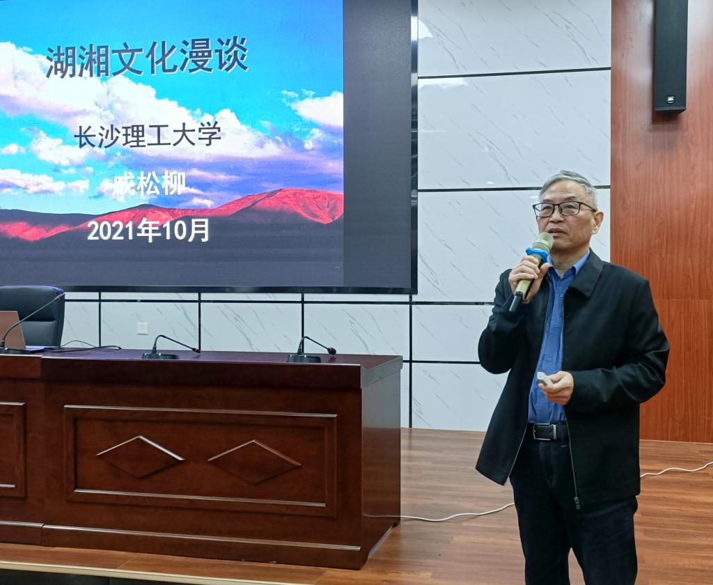 仪式结束后,成松柳随即开展了《湖湘文化漫谈》专题讲座。首先,成松柳以翔实的案例向大家阐释了湖湘精神内涵及特质。他指出,湖南精神应该包含三个层面的内涵:既是对湖湘既往历史文化传统的高度概括;也是目前湖南人生活状态和生存方式的生动写照;更是对湖南未来发展和湖南人精神面貌的期待。接着,他从湘人和湘学的两个维度带领大家厘清湖湘文化发展脉络及湘人对湖湘文化的影响。他重点讲解了屈原、贾谊、曾国藩等湖湘文化名人的思想和社会影响。随后,成松柳从“天下情怀、极富血性、追求事功、崇尚行动”四个方面解读了湖湘文化的特质。他说,天下情怀使得湖湘文化的代表人物总是努力走出去,在更广阔的世界中思考行动,血性豪情与天下情怀是联系在一起的,孕育了湖湘文化中坚韧执着、倔强霸蛮、敢为人先、敢打硬仗的文化因子,成为了湖南人名片。在与大家互动时,成松柳将代表湖湘精神中的心忧天下与责任和担当,敢为人先与创新发展结合起来,寄厚望于现场学生,希望大家传承湖湘文化和红色基因,做有理想、有本领、有担当的新时代大学生。