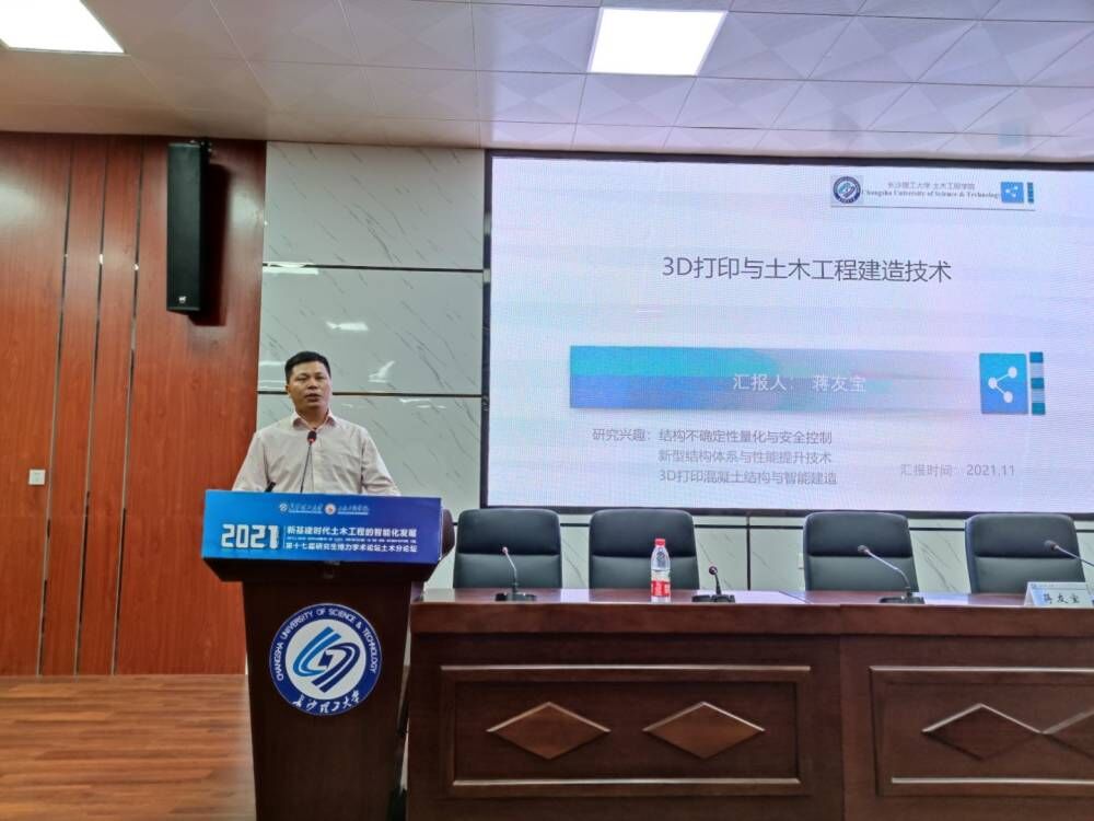 11月5日晚,土木工程学院第十七届研究生博力学术分论坛第二场专题报告会在金盆岭校区四教学术报告厅举行。学院副院长蒋友宝教授应邀作了题为“3D打印与土木工程建造技术”的学术报告。研究生辅导员李小军老师及200余名研究生以及智能建造本科生代表参加活动。