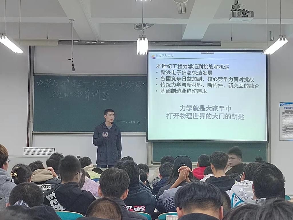 为进一步落实学院专业认证人才培养计划,提升工科学生的综合素质,了解专业发展方向,11月29日晚,土木工程学院在工科三号楼A-208教师举行了题为“力学与工程—学生专业发展”的通识教育讲座。力学系张家滨博士应邀主讲。桥梁及力学专业学生代表100多人参加讲座,讲座由学工办李小军老师主持。