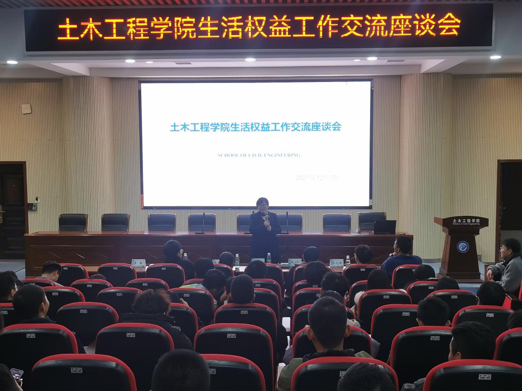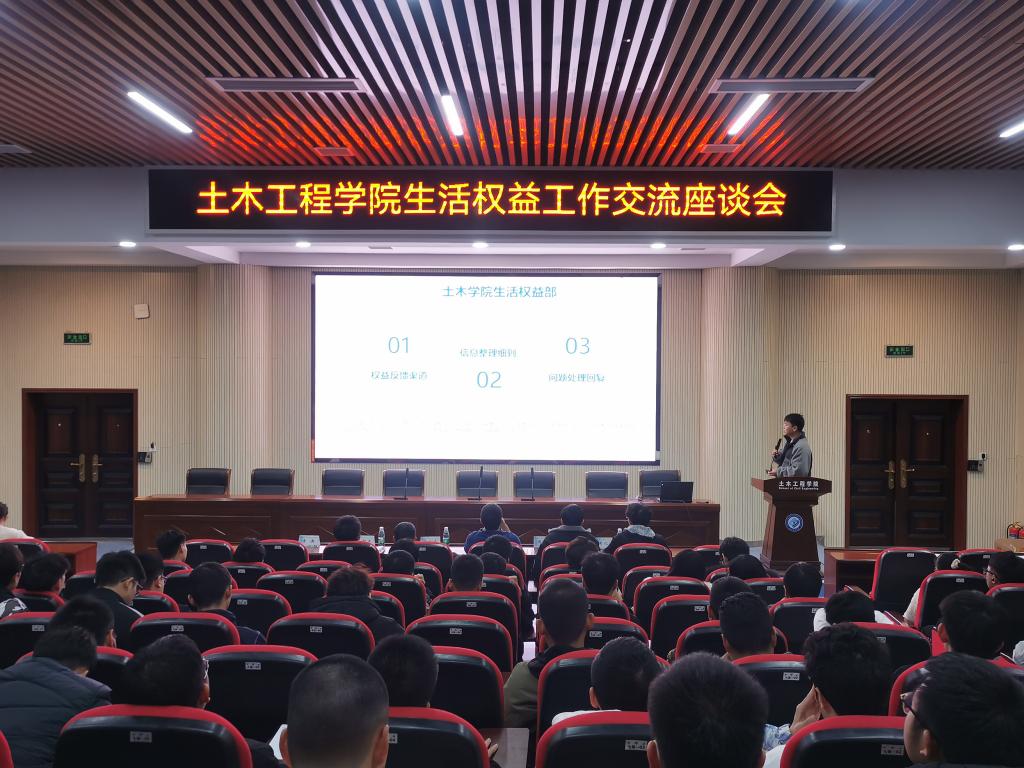 12月10日晚,土木学院于云塘校区工二B302召开全院生活权益工作交流会。院党委副书记黄阿明,21级辅导员邓文杰,云塘校区弘毅轩3栋宿舍管理员周连春,校学生会权益部部长周迅,院学生会轮值主席李澳、邹智杰,院文明督导队队长周亿涛以及全院生活委员和班长与会。会议由李澳主持。