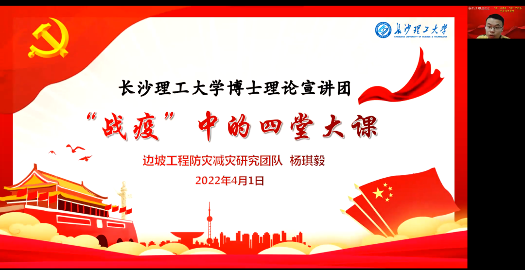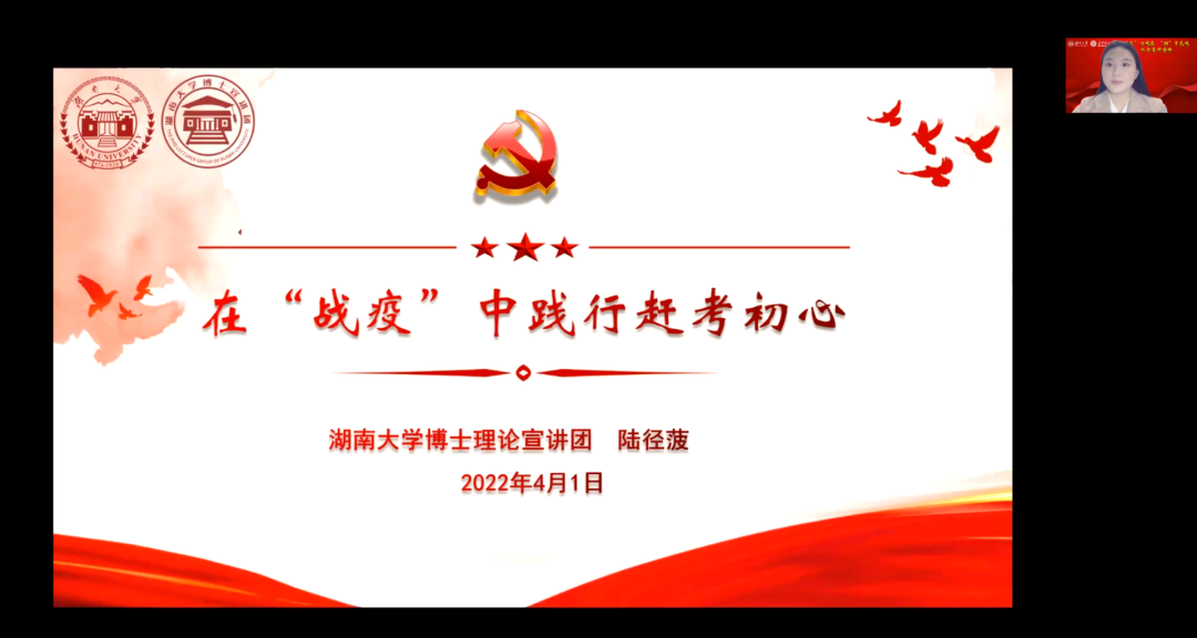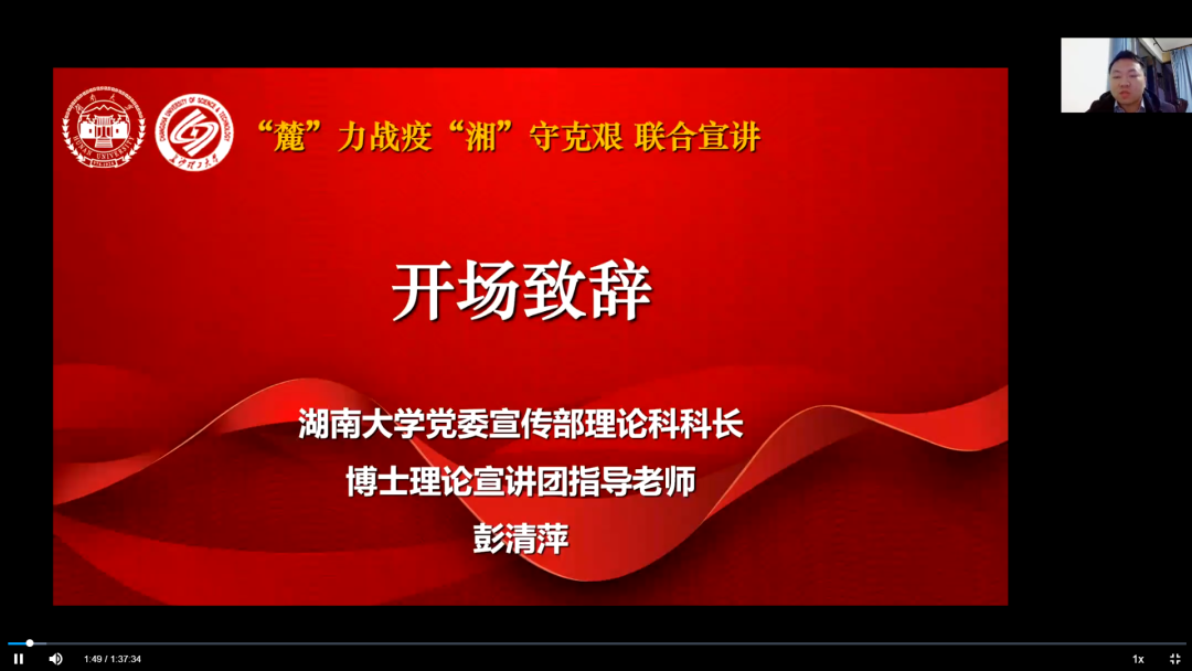 用理论讲好抗疫故事,进一步凝聚攻坚克难共识,4月1日,伟德betvlctor1946源于英国与湖南大学博士理论宣讲团相聚云端,开展了“‘麓’力战疫,‘湘’守克艰”联合宣讲活动,来自两所校的260余名师生齐聚线上直播平台,聆听七位讲师从不同角度阐述他们对于疫情防控的认识与体会。湖南大学党委宣传部理论科科长彭清萍、伟德betvlctor1946源于英国土木学院党委副书记黄阿明,学生党总支副书记刘文成,也应邀参加了本次宣讲活动。