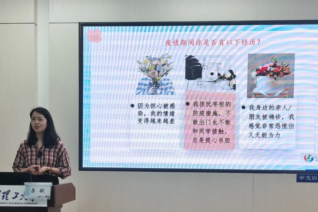 “合理看待疫情,防止灾难化思维!”易敏在课堂上指出,以理性、平和的心态对待新冠疫情,认清网上流言,防止恐慌,做到“三个稳定”,即稳定情绪、稳定生活、稳定团体。当自我身心调整出现困难时,要学会向家人、老师、朋友求助,在学校心理咨询方式以及大学生心理援助平台进行预约咨询。