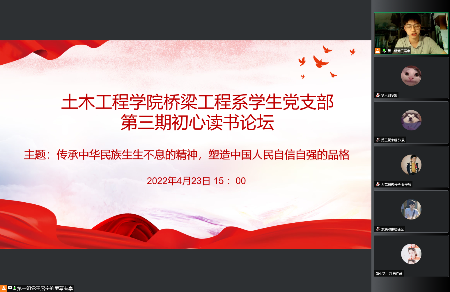 为庆祝中国共产主义青年团成立100周年,进一步落实学院“1357”人才培养体系,响应首届全民阅读大会,落实学院“读书双百”工程,4月23日,在第27个世界读书日,土木工程学院桥梁工程系学生党支部于线上开展第三期“初·心”读书论坛。党支部书记李小军老师,全体学生党员、入党积极分子以及发展对象共同参加,会议由初心读书社社长王展宇主持。