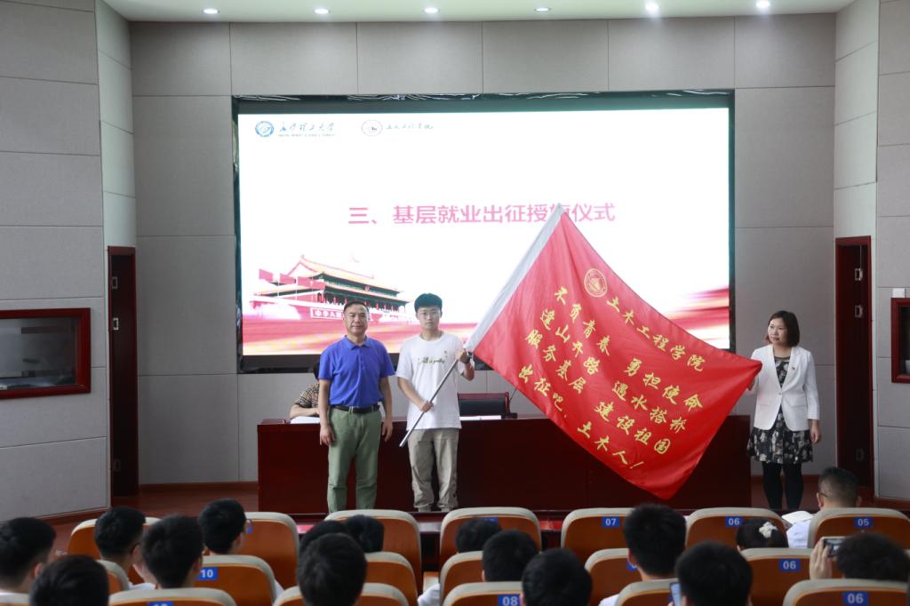 随后,江河为即将奔赴基层就业的毕业生党员授旗并宣布出征。他说,一代代土木人始终把报效祖国作为自己的最高追求,把奉献社会作为自身价值的最大体现。他赞赏了毕业生党员带头志愿赴基层就业的崇高选择,并勉励大家要在扎根基层中坚守初心和理想,自觉锤炼品德修为,不断升华人生境界。