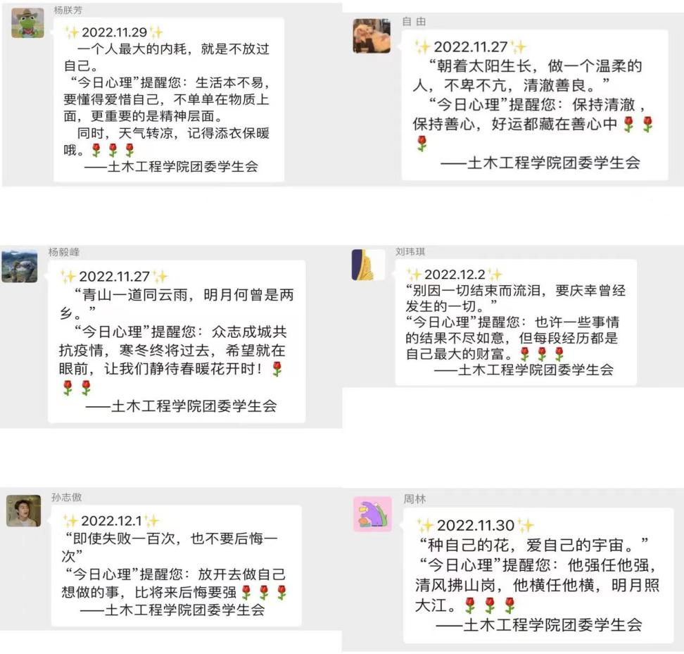 该活动由心理部成员每日为土木工程学院各年级推送积极向上的文案,来普及各方面心理健康知识,丰富学生精神食粮,我们以引导学生思想健康,使之拥有充实而美好的大学生活为初心,用心完成每日推送,自活动开始之日起就获得了学生广泛支持和良好评价。