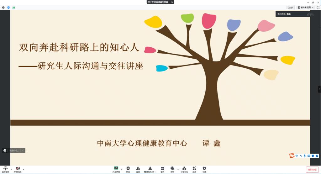 12月8日,土木工程学院云影讲坛系列活动之研究生心理健康主题讲座通过腾讯会议线上举行。中南大学大学生心理健康教育中心专职教师、中国心理学会临床与咨询心理学注册心理师、国家二级心理咨询师谭鑫老师,应邀为研究生做了主题为“双向奔赴-科研路上的知心人”的心理健康讲座。活动由土木学院副书记黄阿明主持,研究生辅导员汪国栋及200余名研究生参加讲座。