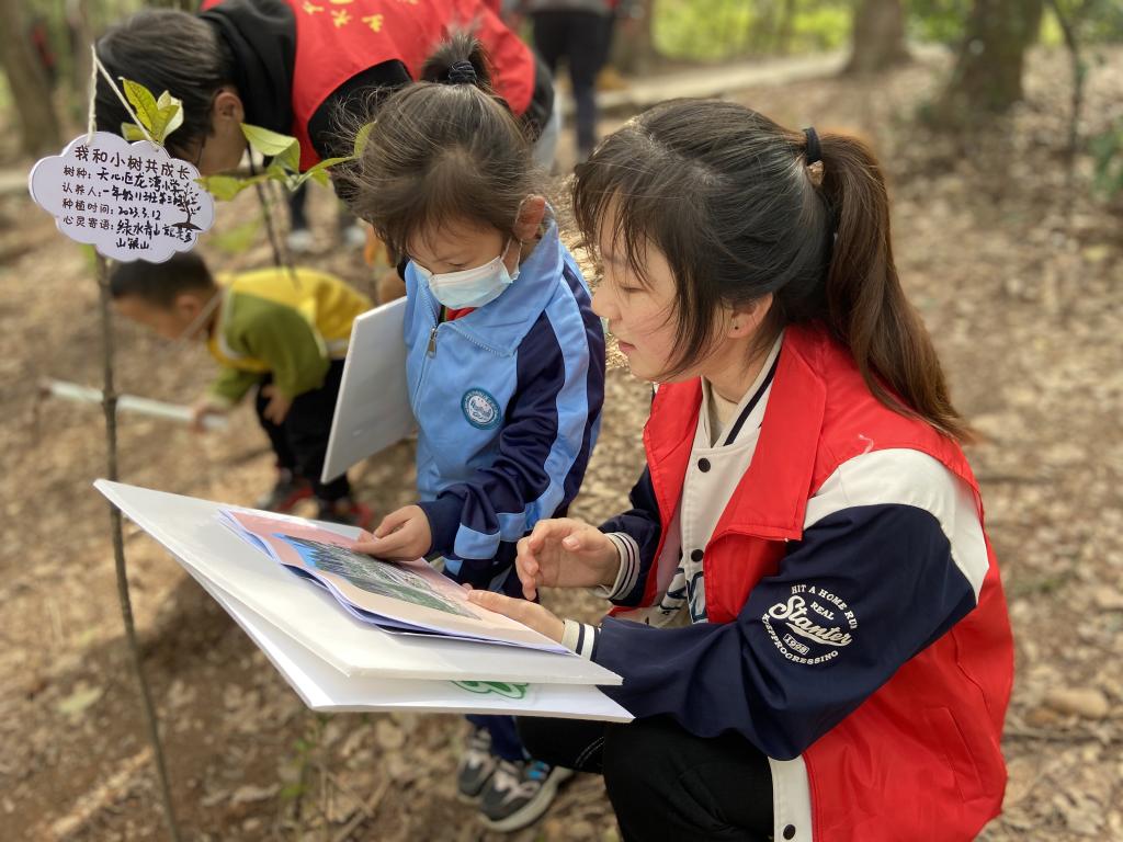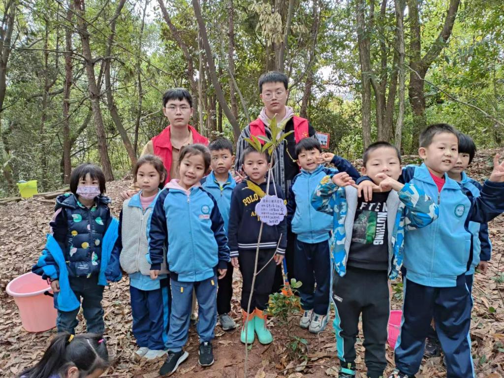 在大学生党员的带领下,11班分成6组开始栽种小树。挖土、栽种、浇水、施肥......一步步体验劳动的快乐。每个大小学生都全神贯注的投入到植树中去,用实际行动爱绿护绿。每组都给小树挂上了认领牌,认领牌上详细地介绍了树种、认领人、日期等详细信息,在家长和大学生的协助下小学生在认领牌上写下了“守护地球家园”“鸟语花香”“绿水青山”等美好祝福。随后,每个小朋友都和小树合影,为下阶段的“我和小树比长高”活动留下对比照片。