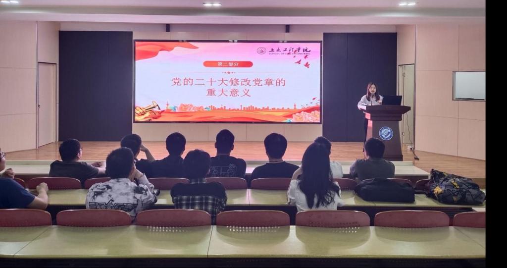 首先是支部书记上党课环节。支部书记从“中国共产党章程基本概述”“党的二十大修改党章的重大意义”“党的二十大关于党章(修正案)决议”“二十大党章的重要修改内容”四个方面做了解读。岩隧工程本科生党支部书记刘文成强调,党章是党内的根本大法,是党的总章程和总规矩,是党的各级组织和全体党员必须严格遵守的基本准则和规定,我们要增强贯彻党章的自觉性和坚定性,坚决维护党章的严肃性权威性,把党章体现到党的各项工作和党员实际行动之中。工程力学本科生党支部书记邓文杰指出二十大党章的修改是深入学习贯彻党的创新理论的需要,是推进党和国家事业发展的需要,是深入推进新时代党的建设新的伟大工程的需要。桥梁工程和建筑工程本科生党支部书记李小军和董治佑在党课后还以一图看懂主题教育带领大家领会学习贯彻习近平新时代中国特色社会主义思想主题教育的精髓要义、实践要求。桥梁工程(卓越)本科生党支部书记林安妮组织全体党员重温入党誓词来进一步强化党员宗旨意识。